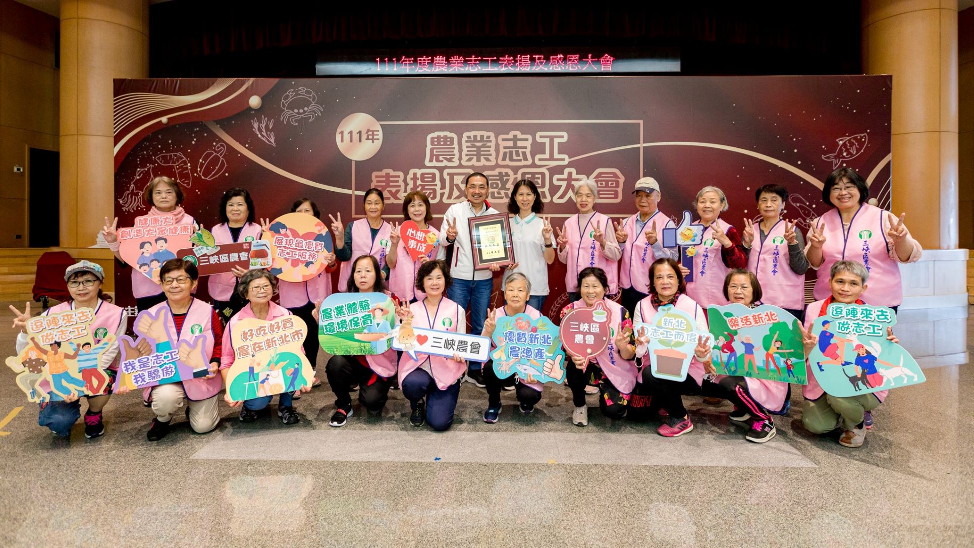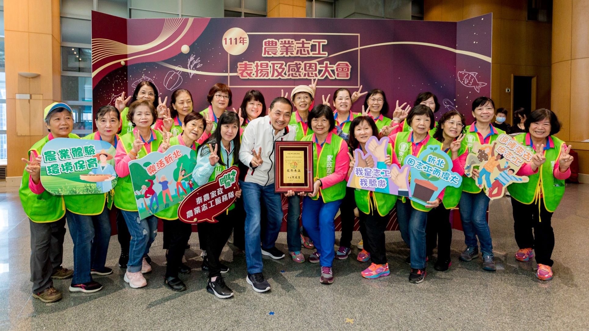 - 新北市政府今(24)日舉辦「111年新北農業志工感恩大會」,由市長侯友宜親自出席頒發感謝狀,感謝22隊農業志工這一年來的付出,讓市民朋友能享受到最優質的農業服務。