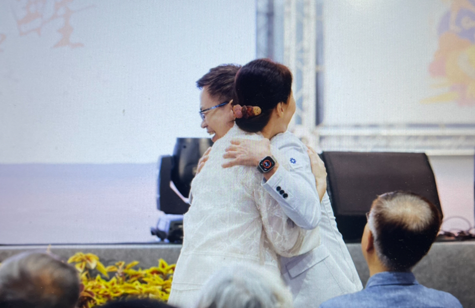 小樹傳愛協會發起人 Dammy 老師與外貿協會 黃志芳 董事長現場示範擁抱心運動