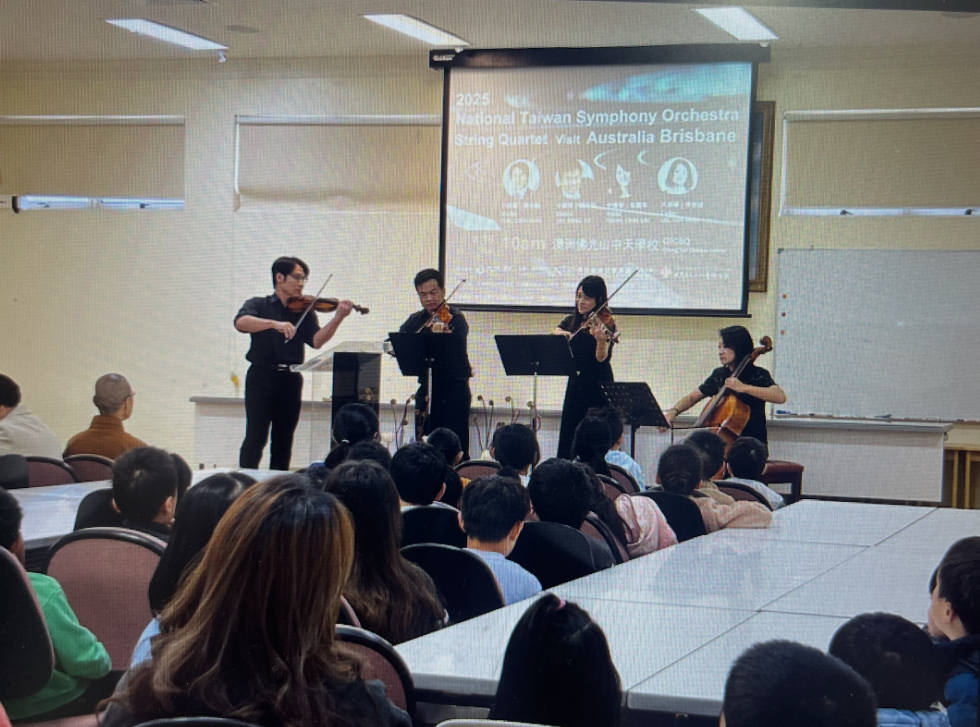 2025年8月16日至18日,國立臺灣交響樂團(National Taiwan Symphony Orchestra,簡稱NTSO)弦樂四重奏應邀赴澳洲布里斯本,展開一系列文化交流演出,足跡遍及佛光山中天學校(Chung Tian Chinese School)、昆士蘭臺灣中心(OCAC in Queensland)、布里斯本慈濟人文學校(TzuChi Academy Queensland)與卡蘭威爾州立中學(Calamvale Community College),四場音樂會共吸引逾600名師生、僑胞及當地觀眾參與。此行不僅展現臺灣專業樂團的音樂實力,更以音樂為橋樑,連結臺灣與澳洲,體現文化外交的深厚意義。