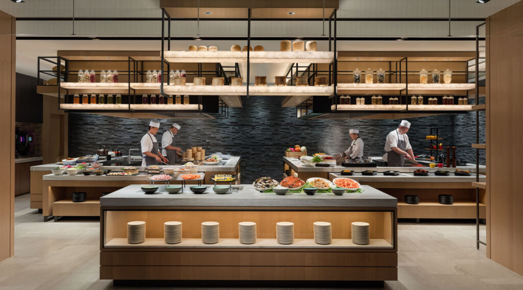 MJ Kitchen提供舒適宜人的空間,並擁有大面玻璃窗景,以開放式廚房為特色,呈現多樣精緻的自助料理區,力邀貴賓享受放空的靜謐時光。(圖/台北國泰萬怡酒店提供)