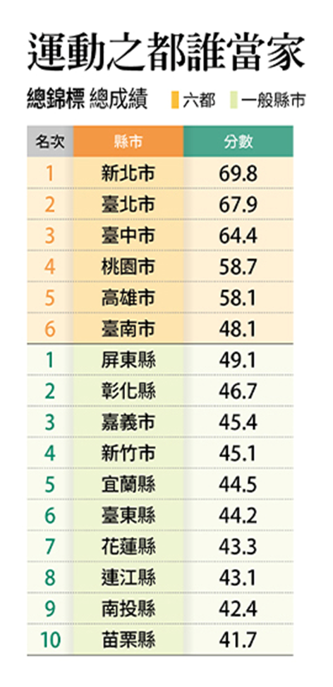 總榜六都組與一般縣市組第二名分別是台北市、彰化縣。台北市在「全民運動」排名全國第一,在其中9個指標,拿下2項第一名、2項第二名、1項第三名;特別是「推動體育運動志工人數」,台北市有5,223人,甚至多於五都志工人數總和。