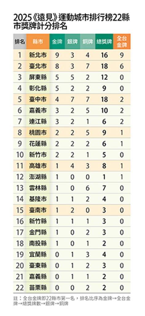 2025《遠見》運動城市排行榜出爐 新北市、屏東縣「競技運動」登頂全國 台北市、嘉義市「全民運動」最給力 全台22座城市各展所長 拚運動實力