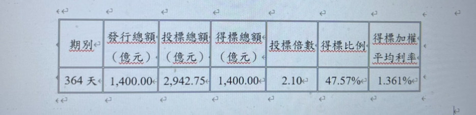 114年9月364天期定期存單開標結果 Leave a Comment / 財經新聞 / By supportadmin_DtcC 本行訂於民國114年9月4日發行364天期定期存單新台幣1,400億元,經於114年9月3日開標,得標結果如次:
