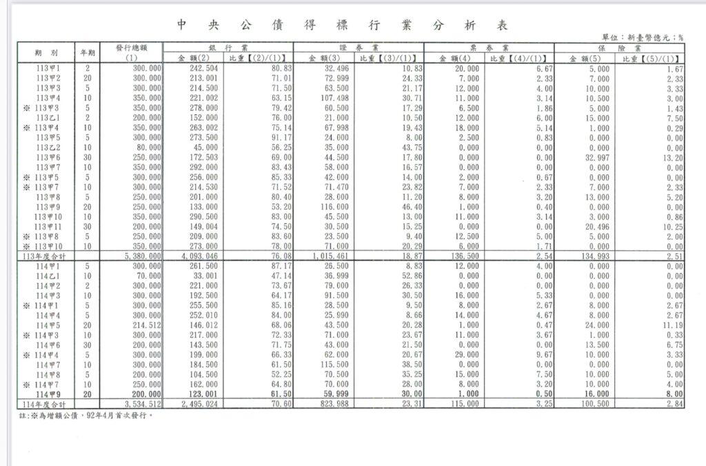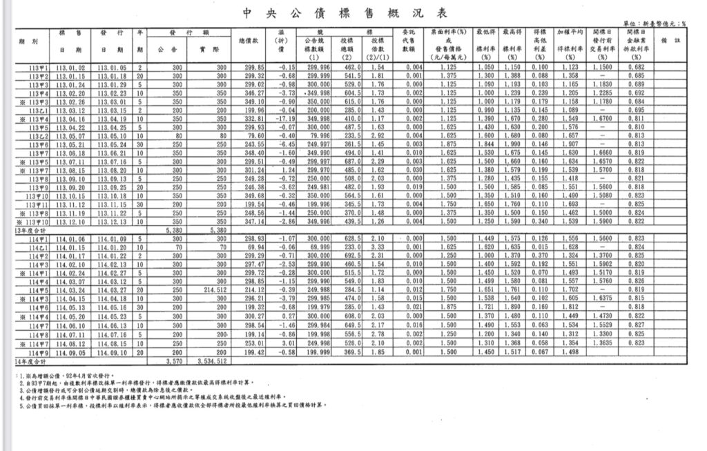 中央銀行114年9月5日公債標售概況表等
