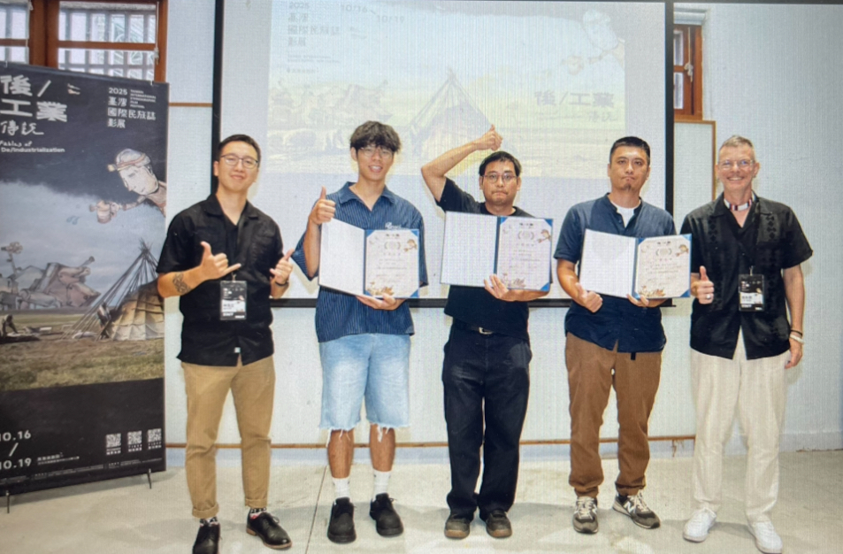 01 2025台灣國際民族誌影展入選台灣團隊合影:左起影展主席林浩立、《大豹:洄游》導演曾宇平、《退潮坐在岸邊》導演潘志偉、《流離之岸》導演勒嘎.舒米、影展策展人施永德