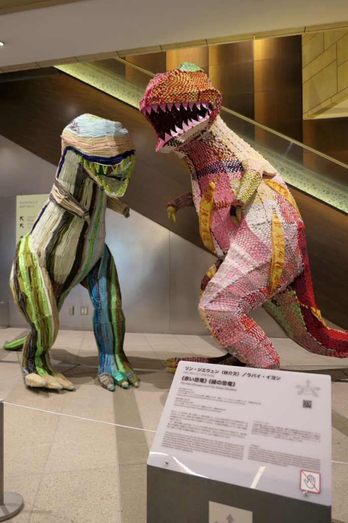 藝術家林介文作品《紅恐龍》及《綠恐龍》於六本木之丘西側廣場2樓展出(駐日臺灣文化中心提供)