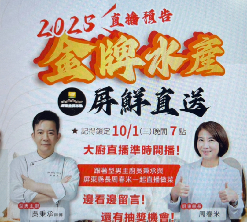 屏東最鮮的海味即將搬上螢幕!屏東縣政府將於 114年10月1日(三)晚間7點進行「金牌水產.屏鮮直送」電商直播。於「屏東新聞PT News」及「型男主廚吳秉承」粉專同步播出活動特別邀請周春米縣長與知名型男主廚吳秉承師傅一同入鏡,現場展現屏東水產品的獨特鮮味與創意料理魅力。觀眾不僅能看到名廚料理,更能即時參與互動,把產地直送的新鮮滋味透過螢幕直接帶回家。