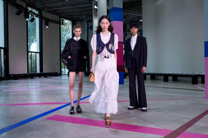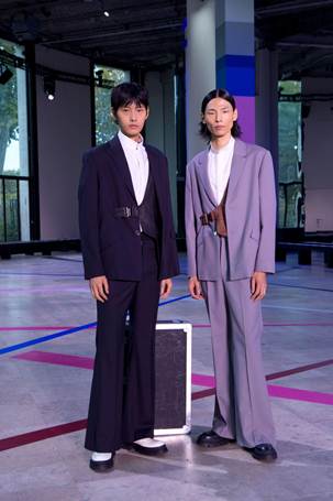 本季共演譯60套服裝,以馬的優雅與速度呼應 70 年代嬉皮的浪漫叛逆,成為靈感核心。色彩以菸草棕、咖啡色、馬鞭草藍紫、黑白為主調,交織亮玫紅、鈷藍、民俗石色,既映照日光下嬉皮的灑脫漫遊,也折射夜幕disco舞池的電光閃爍。輪廓語彙環繞束口與喇叭線條:女裝以大喇叭褲搭配背心,或蕾絲上衣搭配軟料下身,呈現「長加長」的慵懶氣息;軟料套裝營造鬆弛卻不失挺拔;男裝延伸洞洞裝、粗針織背心、五分馬褲、皮褲、流蘇拼接、工裝彎褲及短外套,搭配大喇叭褲。材質與工藝延續嬉皮手作精神,注入十字繡與緞帶繡細節;雪紗、蕾絲與斜紋棉麻印花隨步伐搖曳;馬鞍曲線幻化為口袋結構,蕾絲短褲勾勒輕盈律動。造型以混搭展現自由精神:古董衣與喇叭褲、手勾針織比基尼與西裝的碰撞,流蘇與牛仔、睡衣與正裝,在衝突中交織和諧。從白日嬉皮的詩意倦態,到 Studio 54 鏡球下的迷幻光影,本季以柔中帶剛的語言,書寫女性多重姿態,凝聚「當代東方視角下的自由靈魂」。