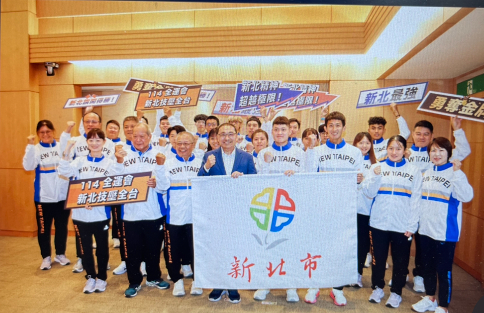 114年全運會登場在即,今(8)日上午由湯智鈞及周庭印代表授旗,新北市派出747名選手征戰國內最高殿堂,侯友宜加碼補助金力挺奪金