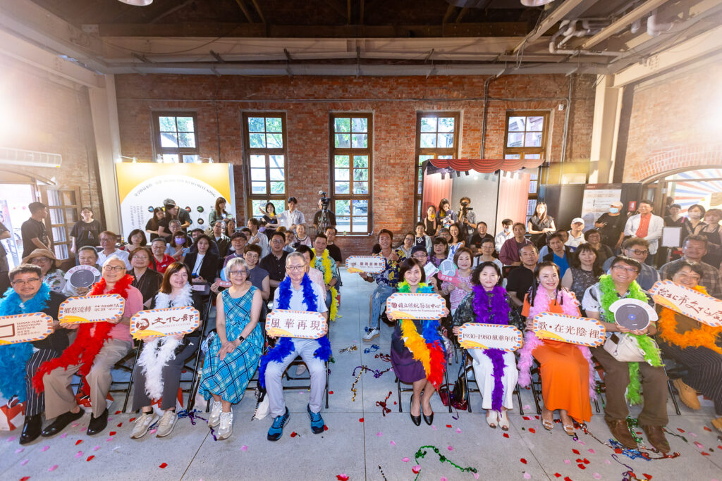 「風華再現—歷史中的流行音樂年代系列活動」以羽毛圍巾與彩帶啟動序幕,左至右為演唱會主持人柯大堡、協辦單位台北市政府文化局科長李岱穎、計畫主持人劉玉霖、總策展人徐玫玲、演唱會嘉賓金佩姍、傳藝中心主任陳悅宜、衛福部部長薛瑞元、文化部影視司專委曾巧芸、華山董事長王榮文、協辦單位國影中心董事長褚明仁。