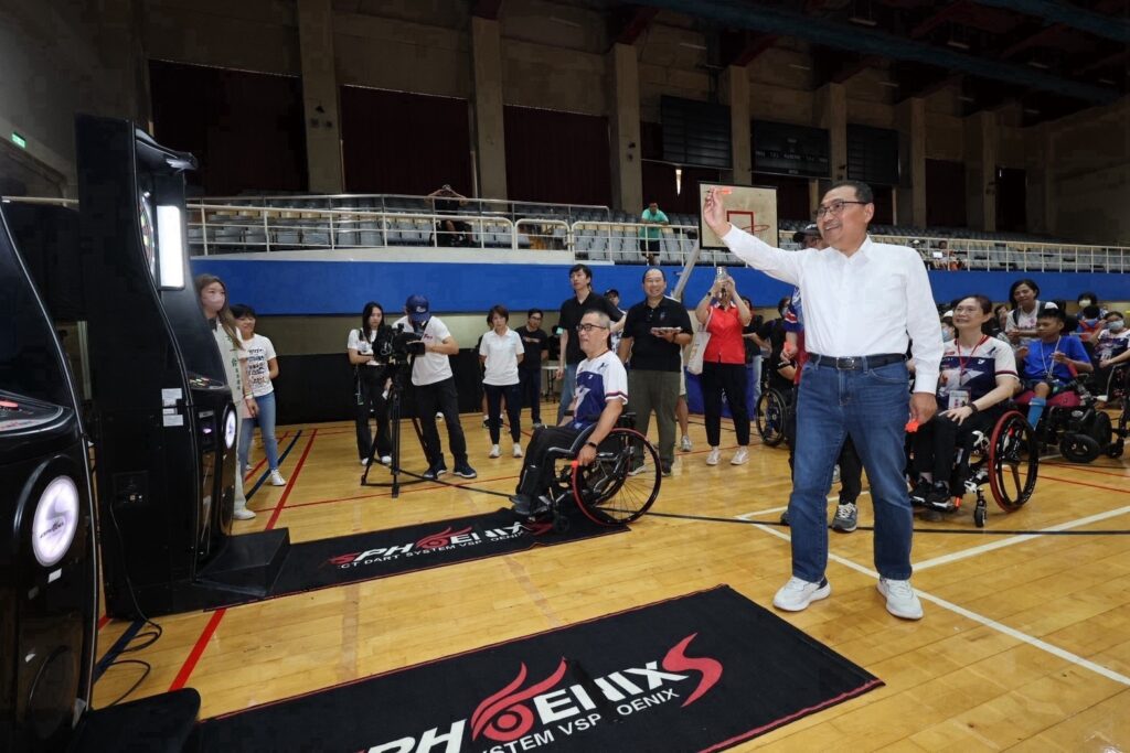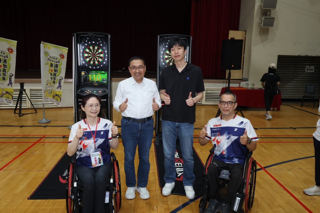 114年新北市身心障礙運動嘉年華,新北市長侯友宜親臨參加開幕,與民眾一同體驗電子飛鏢。