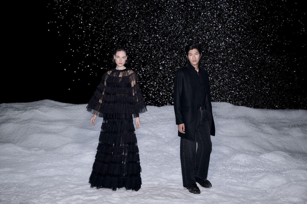 女裝系列以流暢剪裁與層次結構描繪出冬季的優雅輪廓,在極簡與奢華之間取得平衡。輕盈層疊的薄紗長裙與斗篷以黑與裸膚色調為基調,透膚蕾絲與多層次剪裁的對比,勾勒出柔美卻堅韌的女性姿態。細緻刺繡與亮片綴飾隨光流動,宛如雪花般閃爍,展現神秘而充滿力量的冬日魅力。