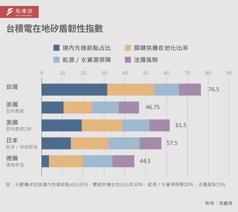 今年9月底,美國商務部長盧特尼克(Howard Lutnick)在專訪中拋出台美晶片五五分構想,震撼市場,亦突顯半導體供應鏈進入新局,台積電在地緣政治夾縫中,被迫在利益和安全中兩難,「矽盾」概念似一步步崩解。《風傳媒》為此透過4個構面,設計可量化的「台積電在地矽盾韌性指數」,以利更加了解台積電於先進製程部分的在地(矽盾)韌性為何。結果顯示,台灣半導體的「韌性指數」達到76.5分,仍居全球之冠;美國則為61.5分,高於