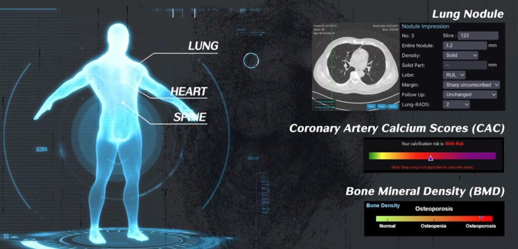 「心肺AI篩檢平台」:利用低劑量胸腔電腦斷層(LDCT)自動分析影像,可同步偵測肺結節、預測冠狀動脈鈣化風險,並支援一鍵生成結構化報告,大幅縮短判讀時間。傳統上,肺、心、骨四項檢測與診斷時間總共需時近6小時,不僅耗時還會使病患接觸大量輻射。透過心肺AI篩檢平台,只要一次胸腔LDCT的取像,再以其AI模型分析影像,大約10分鐘左右就能提供治療建議,大幅減低輻射與時間。