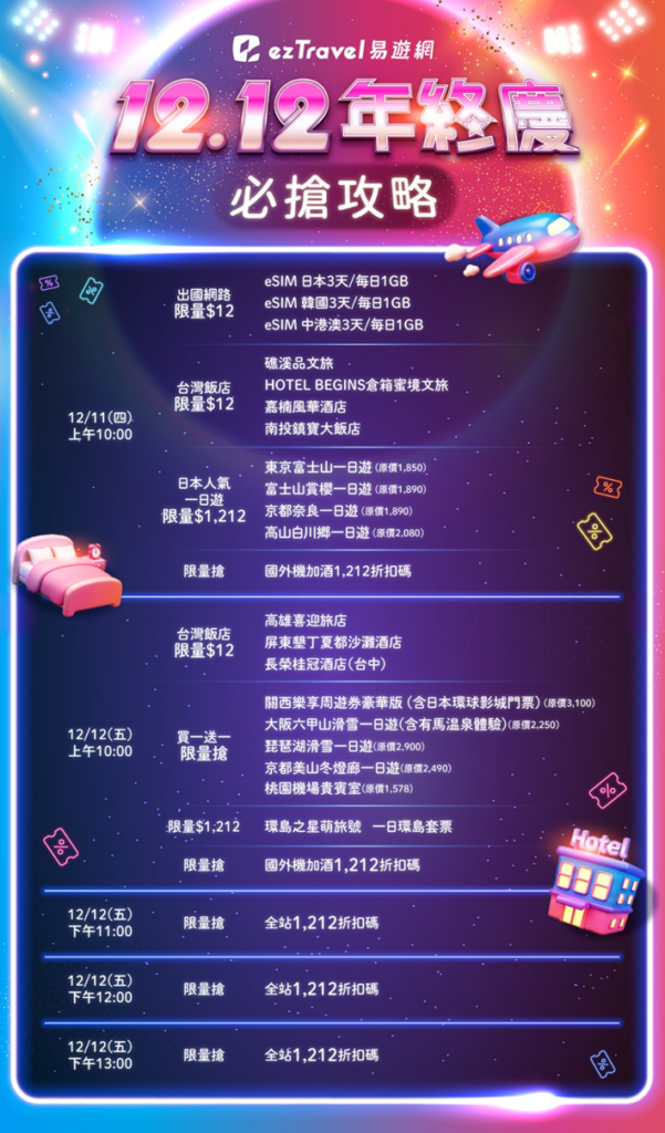 • 易遊網雙12年終慶:(連結預計於12/10上線)