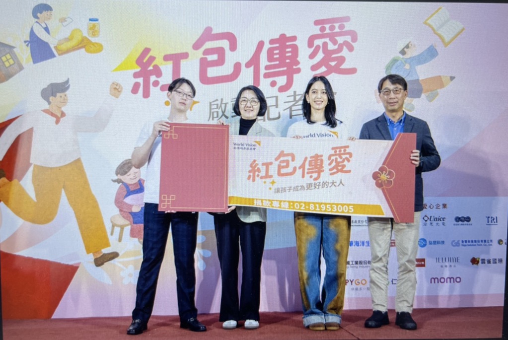 1.台灣世界展望會紅包傳愛啟動記者會,連續25年為弱勢家庭傳愛。左起為自立青年紹華、台灣世界展望會會長李紹齡會長、代言人陳庭妮、展望會副會長蕭文榮。(台灣世界展望會提供)