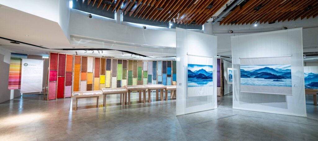 展覽亮點之一是為文化部參展「2025 EXPO大阪・關西萬博」而受邀創作的大型藍染山水〈臺灣母親河〉。作品完整重現工藝師歷經3個半月、上千小時創作過程,以8幅連屏描繪濁水溪曲流的壯闊景致。同時展示此作草圖、色稿、筆記、構圖文件與創作過程影像,讓觀者得以深入理解這件巨作如何在縫紮、絞染、浸染與對色之間反覆累積中成型,展現染織工藝細膩且宏大的力量,以及工藝「漫活SLOHAS」水哲學(H₂O)-Human Heart Over-all漫幸福‧活自在的人心價值。