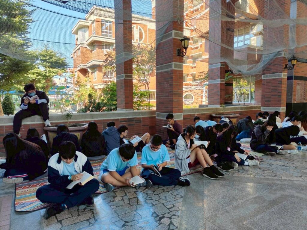 大灣高中教師結合課程,帶領學生走進人權故事車,透過翻閱書籍與交流討論深化對人權的認識。