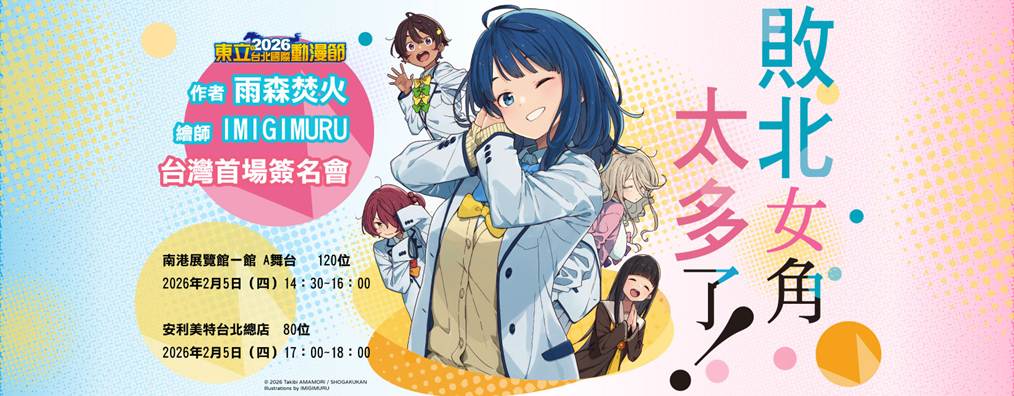 - 活動名稱:《敗北女角太多了!》作者 雨森焚火 繪師 IMIGIMURU 台灣首場簽名會