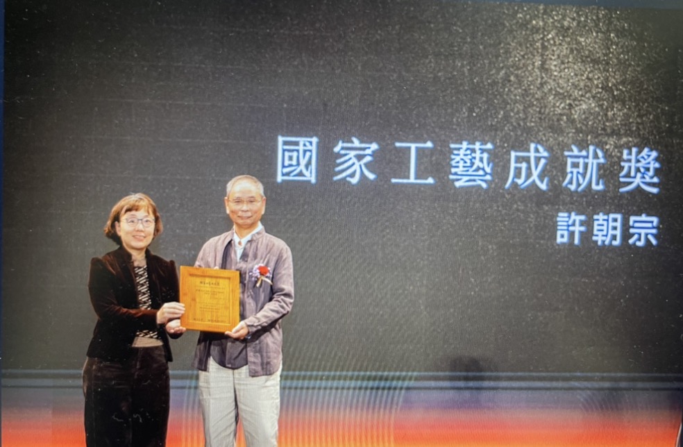 文化部政務次長王時思(左)頒贈國家工藝成就獎獎座予得獎者許朝宗藝師(右),肯定其在臺灣工藝領域的卓越貢獻。