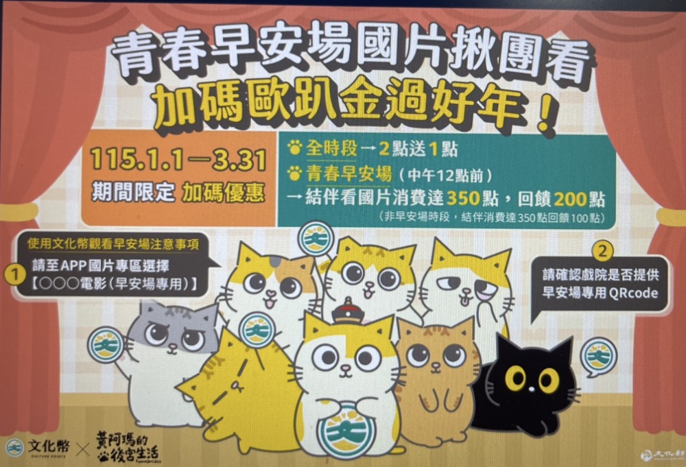 115年文化幣在3月31日前,除了原本全時段看國片消費2點送1點外、結伴看國片滿350點送100點外,觀看早場(中午12點以前)國片,將加碼獲得「青春早安場」消費滿350點再回饋100點「歐趴金」。