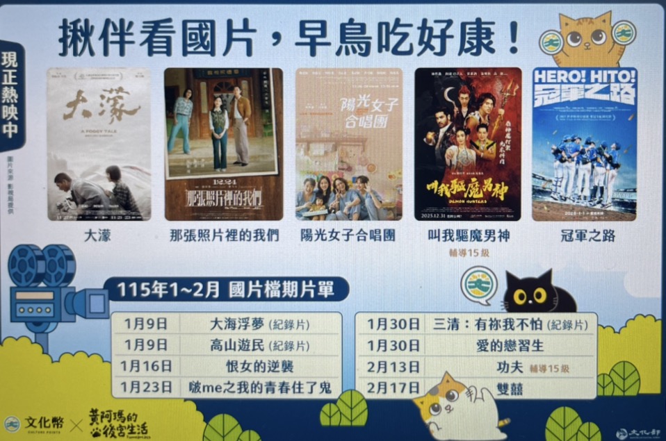 文化部表示,無論是年節團圓、返鄉聚會或大考後想好好放鬆,鼓勵青少年朋友都能把握活動期間「揪起來」走入實體戲院看國片、拿回饋,與親友一同支持臺灣電影,讓國片陪你迎新春、過寒假、考試歐趴。