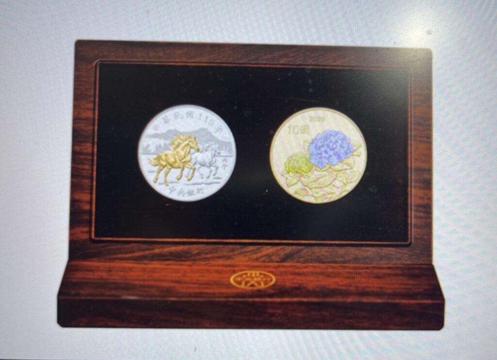 本套幣採銀幣(面額新臺幣100圓)及銅合金幣(面額新臺幣10圓)各一枚組合成套,以先進技術鑄造,展現多元的鑄製工藝之美。銀幣含銀1英兩,正面以局部鍍金的「馬」圖樣為主題,背面以「台北101跨年煙火」為主題;銅合金幣正面以幾何元素交織出馬匹形體為主構圖,背面則為部分上彩的「繡球花」。本套幣包裝盒設計典雅,底座及展示架結合成一體,豎立時可雙面展示,提供更佳的賞玩體驗;並以珠光斜織紋紙盒盛裝,包裝精緻,極具珍藏價值。
