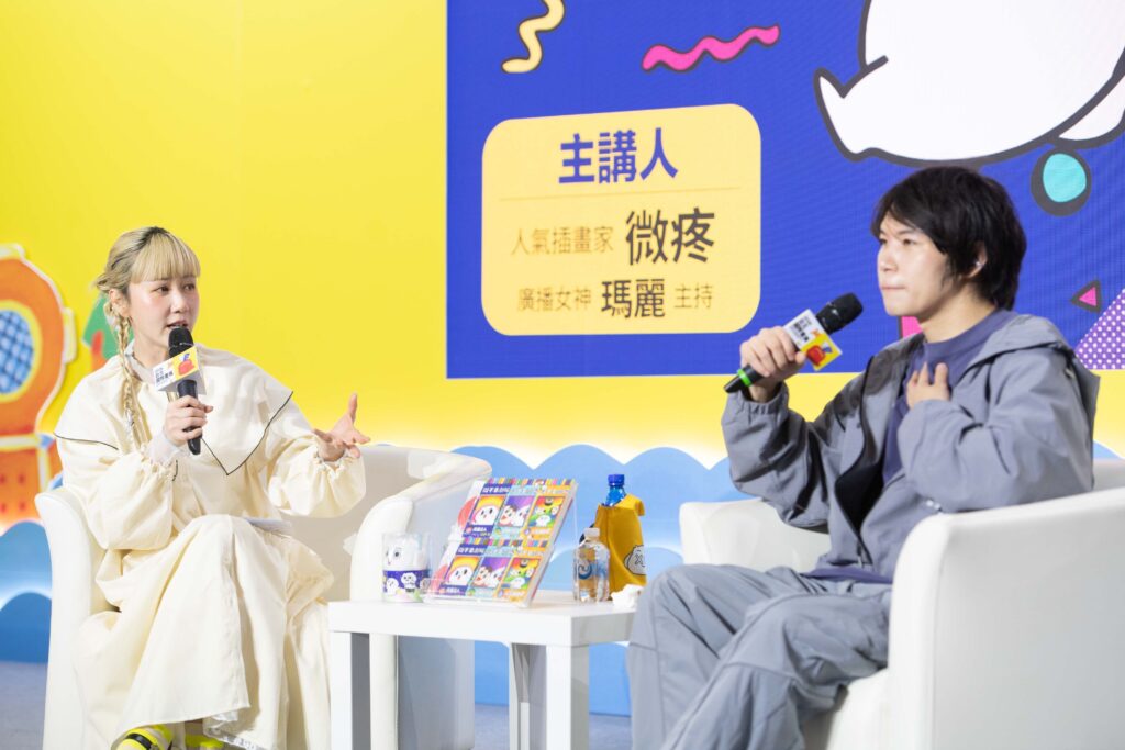 微疼介紹了新作品《微不幸劇場》(1-3冊),這些書整合了他過往的漫畫故事與生活體驗。微疼說,其中最印象深刻的故事,是將兩場籃球賽串連成一個荒謬搞笑的比賽過程,不僅展現青春趣味,也回想起荒唐往事。書中每個小彩蛋雖毫無關聯,但都反映他對生活細節的敏銳觀察與幽默自嘲。