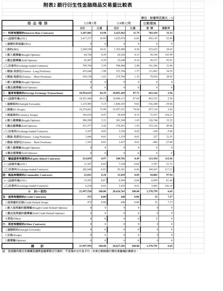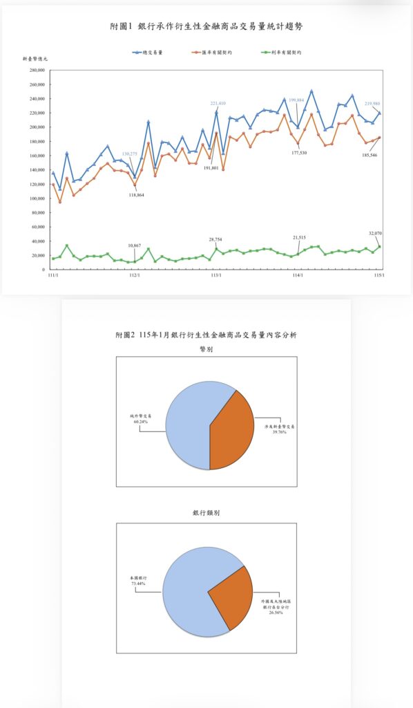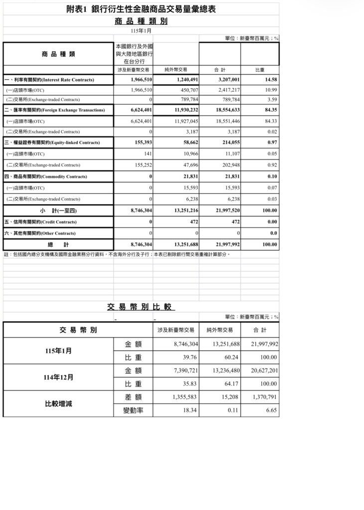 115年1月銀行承作衍生性金融商品交易量如下:匯率契約折合新臺幣18兆5,546億元、利率契約3兆2,070億元、權益證券契約2,141億元、商品契約218億元及信用契約5億元,合計21兆9,980億元(附表1、附圖1),較上月增加6.65%,主要係換匯交易增加所致(附表2)。茲就交易內容分析如下: 一、商品種類: 匯率契約占84.35%、利率契約占14.58%、權益證券契約占0.97%及商品契約占0.10%(附表1)。 二、交易幣別: 涉及新臺幣交易占39.76%,交易量較上月增加18.34%;純外幣交易占60.24%,交易量較上月增加0.11%(附表1、附圖2)。 三、銀行類別: 本國銀行交易量占73.44%;外國及大陸地區銀行在台分行交易量占26.56%(附圖2)。交易量前五大銀行依序為中國信託、國泰世華、永豐、渣打及台北富邦銀行,合計占總交易量之40.43%。 四、交易變動: 各類交易量與上月比較,其中匯率契約增加4,632億元或2.56%,利率契約增加7,834億元或32.33%,權益證券契約增加1,134億元或112.56%,商品契約增加108億元(附表2)。