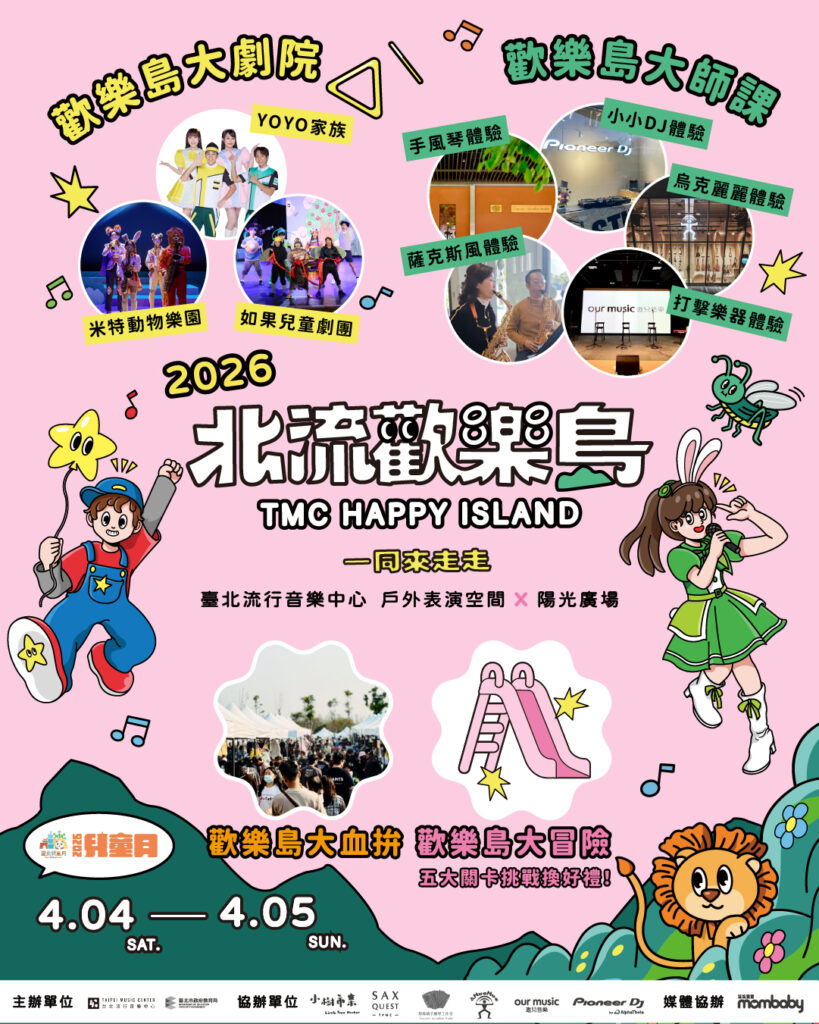 全臺最受期待的親子音樂盛事「2026北流歡樂島」,即將於今年4月兒童節連假熱鬧展開!超越去年規模,臺北流行音樂中心今年將在南基地打造為一座巨大的奇幻樂園,將經典復古童玩與遊樂設施驚喜「放大」!歡樂島以「屬於孩子的遊樂園」為出發點,從戶外表演空間到陽光廣場,規劃「歡樂島大冒險」、「歡樂島大劇院」、「歡樂島大師課」以及「歡樂島大血拚」四大主題區。活動結合巨型實體童玩遊樂設施、音樂劇演出、串聯園區店鋪的職人音樂體驗課程,以及親子永續二手市集「小樹市集」,邀請全臺大小朋友一同登島「趣」冒險!今年由臺北流行音樂中心(以下簡稱北流)與臺北市政府教育局攜手主辦,並再次聯手「臺北兒童月」精彩登場。讓歡樂不只停留在連假,更要讓音樂與笑聲充滿整個四月,陪伴孩子度過最豐富繽紛的兒童月。
