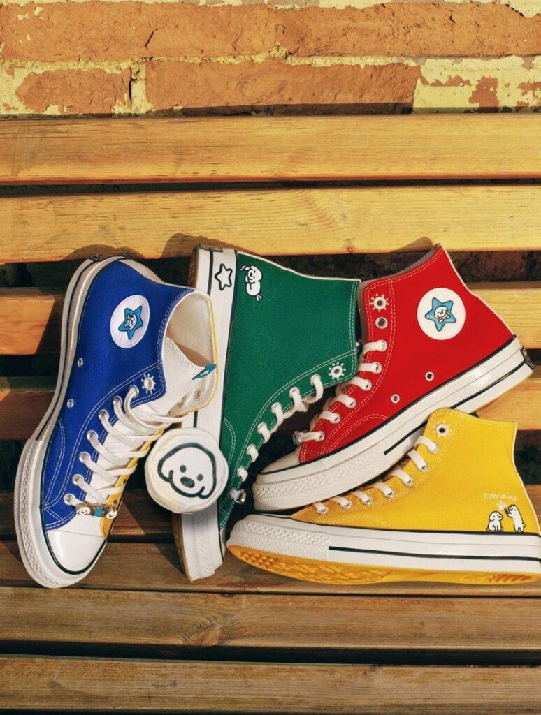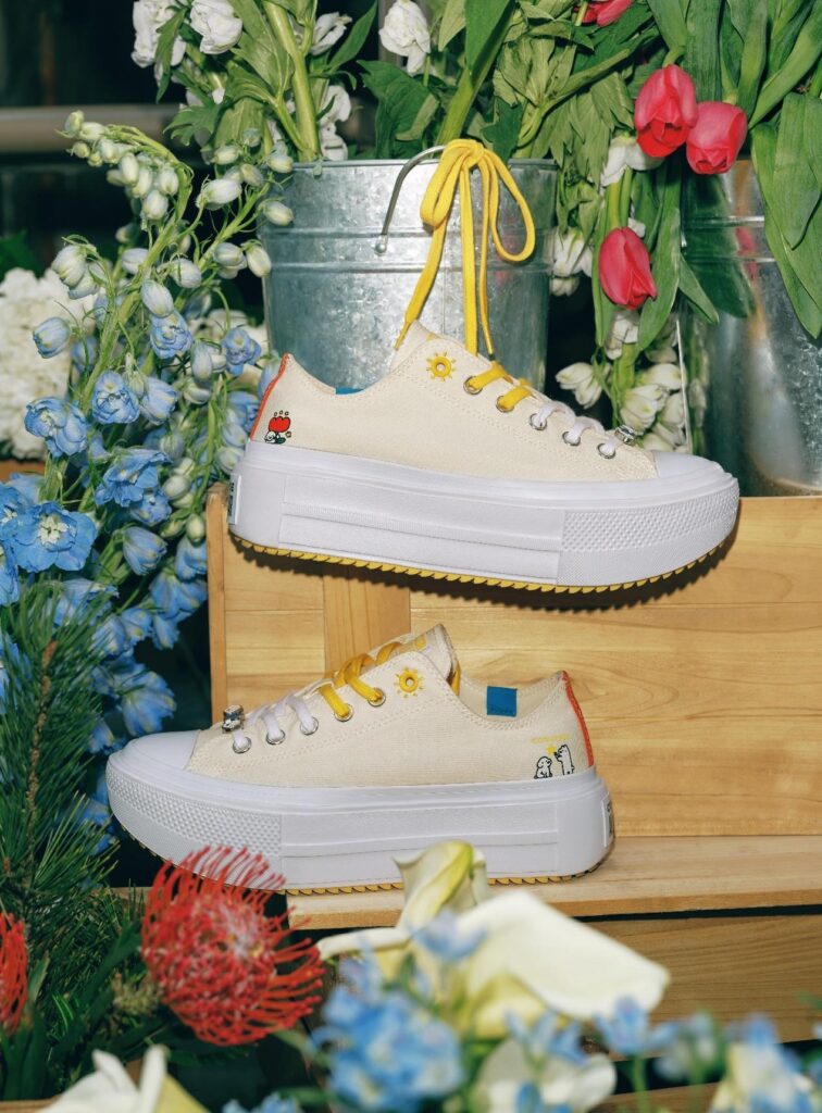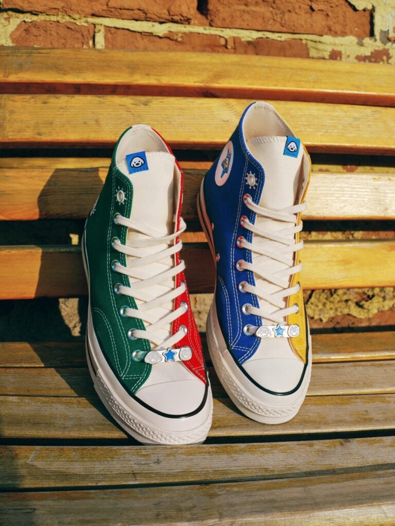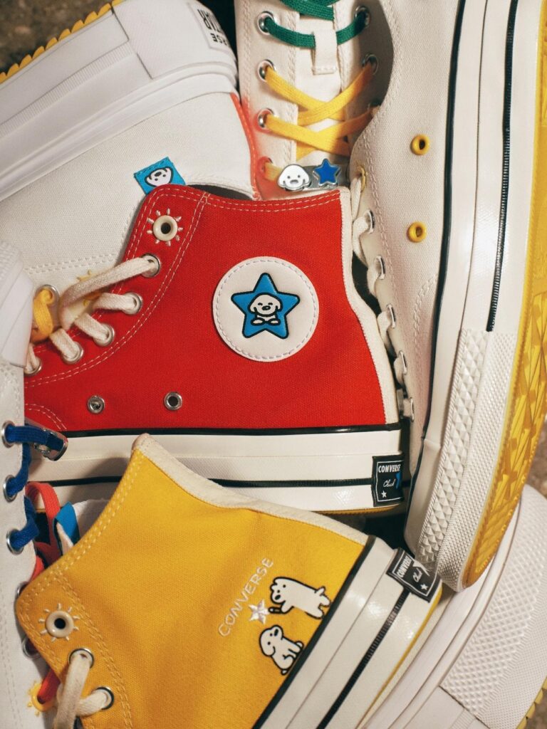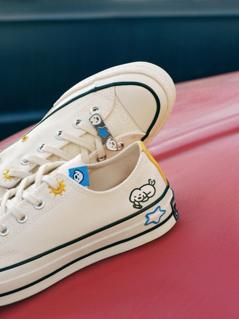 系列帶來兩款 CHUCK 70 聯名鞋型:多彩 70 高筒鞋款透過不對稱撞色設計呈現更鮮明的視覺層次,鞋側點綴聯名圖案,並搭載 ORTHOLITE 避震中底,在經典外觀之中兼顧舒適腳感;彩繪 70 低筒鞋款延續條紋橡膠鞋底與帆布鞋面結構,以更輕鬆的配色與插畫細節呈現自然隨性的風格與高級質感。兩款鞋型均附帶多組鞋帶,並配有聯名配件包,讓風格切換更加自由。
